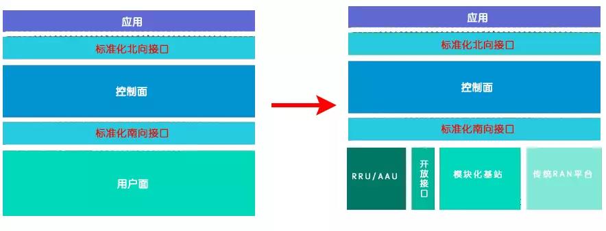 简单的讲,就是借助用户面和控制面分离的趋势,在控制面上下构建开放的标准化北向接口和南向接口,以此开发模块化的基站软件,通过开放接口实现模块化组站。