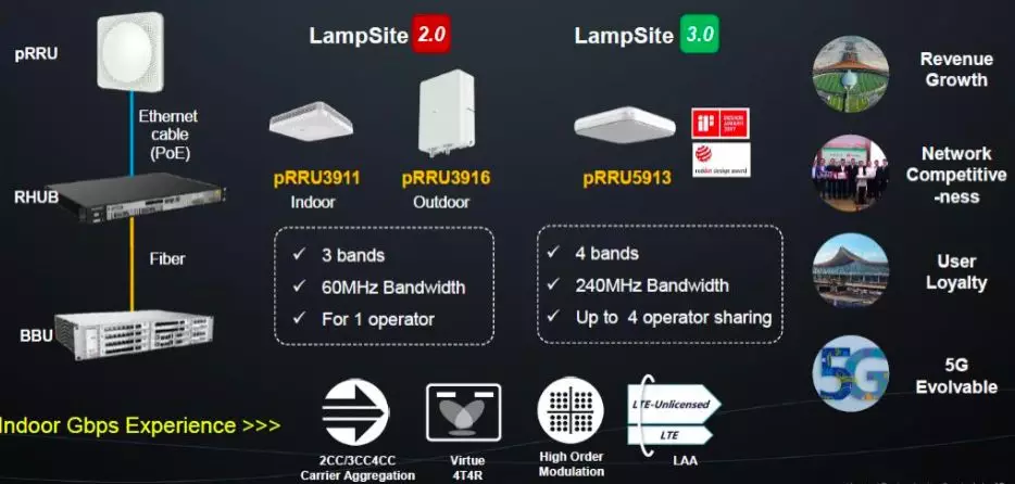 华为作为Small Cell市场的领导者,产品覆盖全球(除美国外),产品支持3G和4G,以及LTE-A载波聚合、LTE-LAA和LWA等,产品范围从femtocell到picocell到公共WiFi,再到LampSite分布式无线系统,其LampSite 3.0产品可同时支持多达4家运营商,最近还发布了5G LampSite,支持5G NR和LTE。华为Service Anchor解决方案为移动边缘计算(MEC)驱动的企业服务提供了API接口,它与LampSite相结合可丰富未来室内应用,比如基于位置定位的商家新品推送、促销广播等服务等。