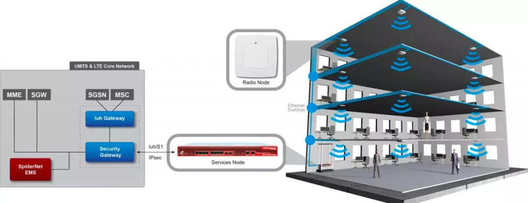 服务节点相当于Cloud RAN控制器,可连接到LTE核心网。无线节点支持LTE、LTE-U和LAA,采用PoE供电。