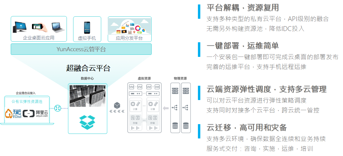 YunAccess云管理平台可以用于支持多个云平台的管控,包括基于VMware或OpenStack自建的的私有云平台,虚拟化平台以及租用的阿里云,天翼云等公有云资源。